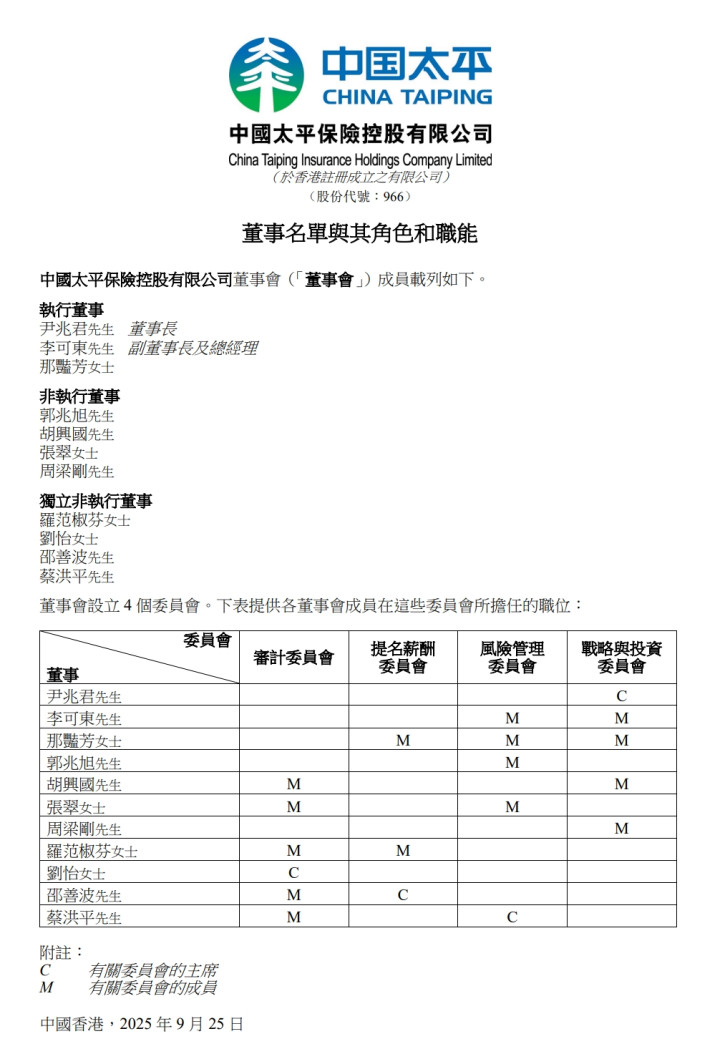 中国太平官方信息也显示,那艳芳已担任中国太平保险集团有限责任公司及中国太平保险集团(香港)有限公司执行董事。